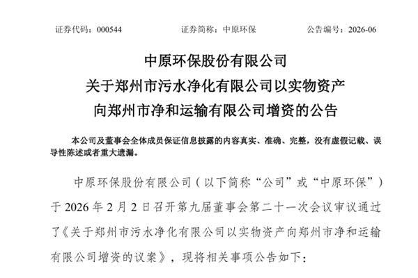 中原环保股份有限公司(简称:中原环保)公告称,为优化公司资源配置,提高资产使用效率,提升专业化运营水平,公司全资子公司郑州市污水净化有限公司(下称“净化公司”)拟将下属郑州新区污水处理厂(二期)及南曹污水处理厂共17辆污泥运输车辆,以实物资产作价出资的方式增资至净化公司全资子公司郑州市净和运输有限公司(下称“净和运输公司”)。