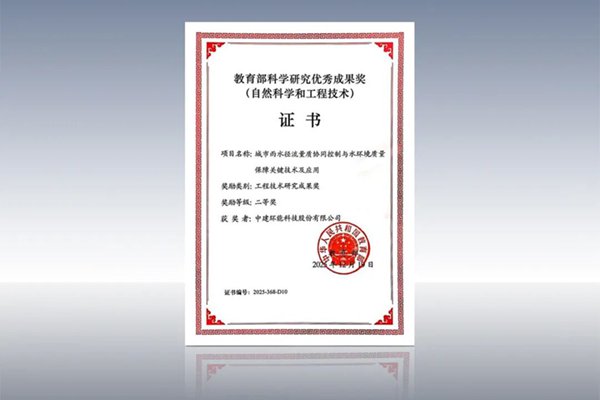 近日,教育部2025年度“科学研究优秀成果奖(自然科学和工程技术)”获奖名单正式揭晓。由北京建筑大学牵头,中建环能科技股份有限公司、哈尔滨工业大学、中国环境科学研究院等单位合作完成的“城市雨水径流量质协同控制与水环境质量保障关键技术及应用”项目,凭借其显著的技术创新与广阔的推广应用前景,荣获工程技术研究成果二等奖。此前,该成果已通过中国环境科学学会组织的权威成果鉴定,被评定达到“国际领先”水平。