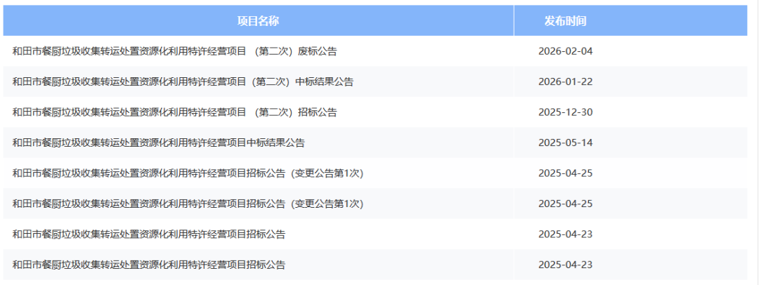 新疆和田市餐厨垃圾收集转运处置资源化利用特许经营项目(第二次)废标公告发布。公告显示,由于中标单位自愿放弃本项目中标资格,经招标人研究决定,现本项目予以废标,将重新组织招标。
