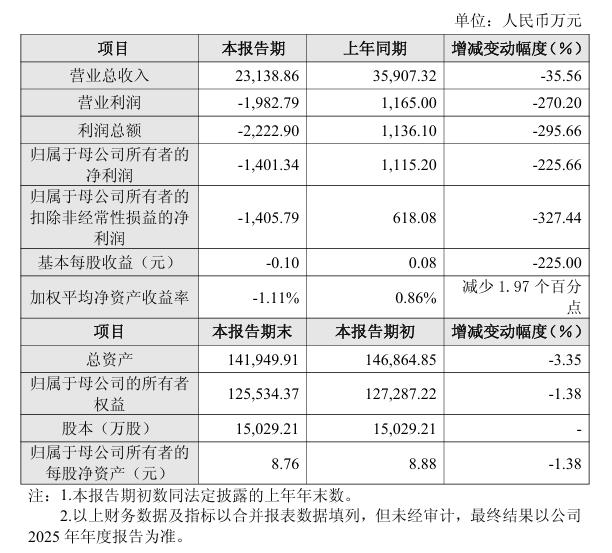北京九州一轨环境科技股份有限公司(简称:九州一轨)近日发布《2025年度业绩快报》。报告期内,九州一轨实现营业总收入23,138.86万元,较上年同期下降35.56%;实现归属于母公司所有者的净利润-1,401.34万元,较上年同期下降225.66%;实现归属于母公司所有者的扣除非经常性损益的净利润-1,405.79万元,较上年同期下降327.44%;2025年末总资产141,949.91 万元,同比下降3.35%;归属于母公司的所有者权益125,534.37万元,同比下降1.38%。
