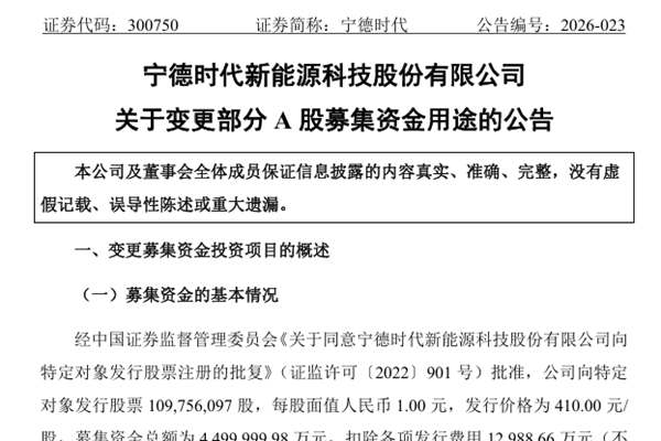 宁德时代新能源科技股份有限公司(简称:宁德时代)近日公告称,根据公司长期战略规划和现阶段发展需求,为进一步推动业务发展、满足市场需求、提升产品竞争力的同时提高募集资金使用效率,经谨慎研究和论证分析,公司拟将截至2026年2月28日“广东瑞庆时代锂离子电池生产项目一期”尚未投入的募集资金480,000.00万元(包含全部利息收入,具体金额以实际结转时募集资金专户资金余额为准)用于“时代新能厦门电池产业基地项目”(下称“本项目”),不足部分由公司根据项目建设实际需要以自有资金或自筹资金投入。