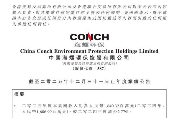 近日,中国海螺环保控股有限公司(简称:海螺环保)披露截至二零二五年十二月三十一日止年度业绩。报告期内,海螺环保收入约为人民币1,640.32百万元(2024年:人民币1,686.99百万元),同比减少2.77%;权益股东应占亏损约为人民币228.43百万元,2024年权益股东应占净利润约为人民币6.28百万元。