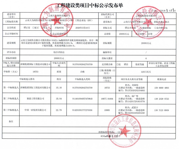 云南大为制焦有限公司干熄焦节能环保项目(一期)工程总承包(EPC)(二次)中标候选人公示。