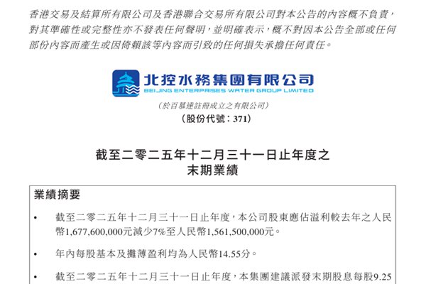 当前位置:中链企通环保网 > 新闻资讯 > 北控水务集团:2025年归母净利润15.62亿元,同比下降6.92%