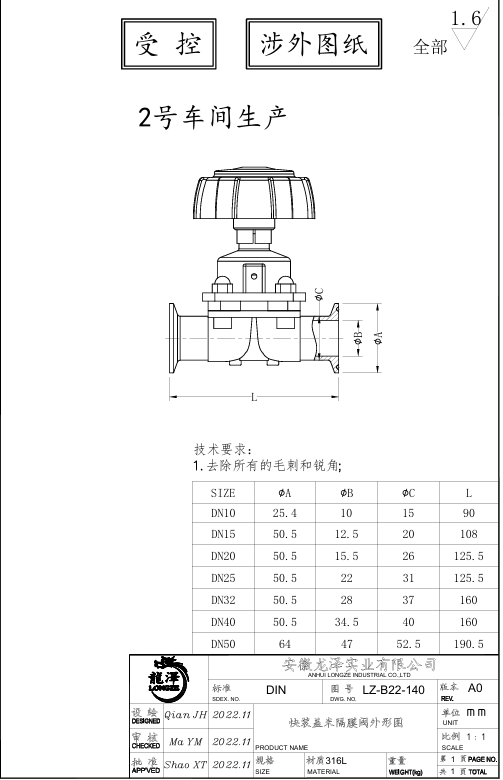 龙泽316L不锈钢DIN快装盖米隔膜阀食品卫生级分体复合膜片快装阀