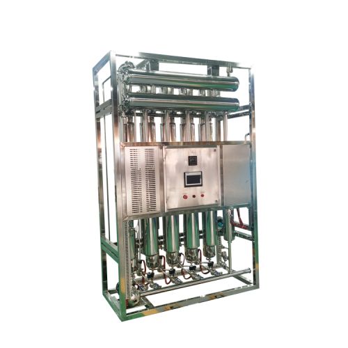 采用分体式汽水四分离技术(汽水离心分离、下旋片隔板分离、丝网捕捉水滴分离、上旋片隔板分离)保证蒸水热源及内毒素含量更低。对纯水要求相对较低,单级反渗透(10us/cm]以下即可产出符合药典标准的蒸馏水