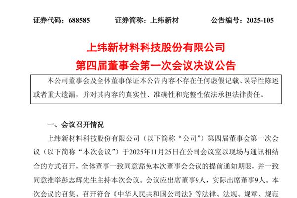 上纬新材料科技股份有限公司(简称:上纬新材)公告称,公司于2025年11月25日召开第四届董事会第一次会议,审议通过《关于选举公司第四届董事会董事长的议案》等。