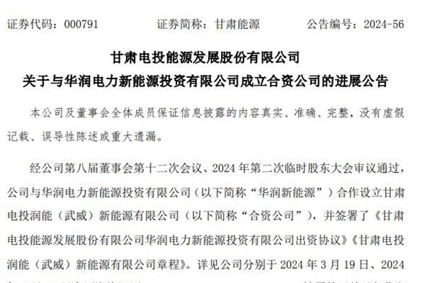 近日,甘肃电投能源发展股份有限公司(简称:甘肃能源)发布公告称,公司与华润电力新能源投资有限公司(简称“华润新能源”)合资成立的甘肃电投润能(武威)新能源有限公司(下称“合资公司”)进展顺利,双方已签署合资协议及合资公司章程,并得到了公司董事会及股东大会的批准。 据了解,成立合资公司主...