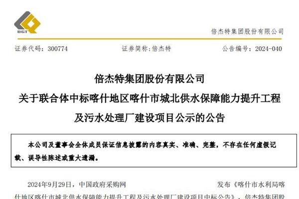倍杰特集团股份有限公司(简称:倍杰特)10月8日公告称,公司与中建新疆建工(集团)有限公司组成的联合体最终成为了喀什地区喀什市城北供水保障能力提升工程及污水处理厂建设项目的供应商,中标(成交)金额为107400万元。项目特许经营期限为30年,其中建设期为22个月。 项目服务范围包括: 1)供水工程新建最高日供水量7.91万m&su...