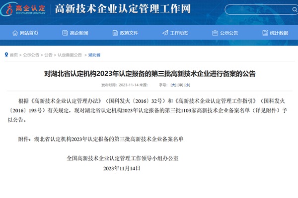 近日,全国高新技术企业认定管理工作领导小组办公室下发“对湖北省认定机构2023年认定报备的第三批高新技术企业进行备案的公告”,中国城乡旗下中城乡生态环保工程有限公司(以下简称:中城乡生态)通过认定。至此,中国城乡大家庭中的“高新技术企业”已增至16家。 高新技术企业是指在《国家高新技术...