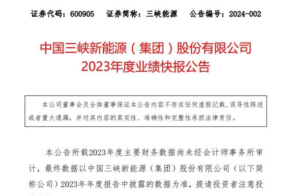 1月20日,中国三峡新能源(集团)股份有限公司(简称:三峡能源)发布2023年度业绩快报,2023年1-12月,其累计实现营业总收入264.51亿元,较上年同期(调整后)增长11.08%,归属于上市公司股东的净利润73.46亿元,较上年同期(调整后)增长4.50%。截至本报告期末,公司资产总额为3,111.51亿元,较期初(调整后)增...