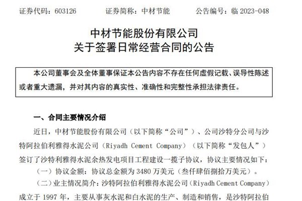 11月29日, 中材节能股份有限公司(简称:中材节能)发布公告,表示公司沙特分公司已经与沙特阿拉伯利雅得水泥公司(Riyadh Cement Company)签订了沙特利雅得水泥余热发电项目工程建设一揽子协议,协议主要情况如下: (一)协议金额:协议总金额为 3480 万美元(叁仟肆佰捌拾万美元)。 (二)业主情况简介:沙特阿拉伯...