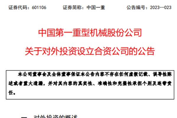 8月22日,中国一重发布(简称:中国一重)《中国第一重型机械股份公司关于对外投资设立合资公司的公告》。 公告显示,中国一重联合了哈尔滨电气集团佳木斯电机股份有限公司、黑龙江辰能清洁能源有限公司、上海电气新能源发展有限公司、北京天润新能投资有限公司,将共同组建黑龙江省新能源开发平台公司。合资公司注册资本100,000万元。中国一重作为...
