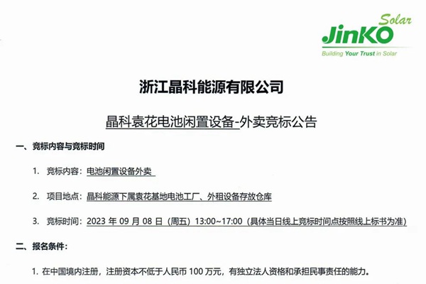近日,晶科能源发布电池闲置设备公开对外销售竞标公告,拟外卖公司电池闲置设备,项目地点:晶科能源下属袁花基地电池工厂、外租设备存放仓库,竞标时间:2023年09月08日(周五)13:00~17:00(具体当日线上竞标时间点按照线上标书为准)更多内容详见↓ 一、竞标内容与竞标时间: 1. 竞标内容:电池闲置设备外卖 2. ...