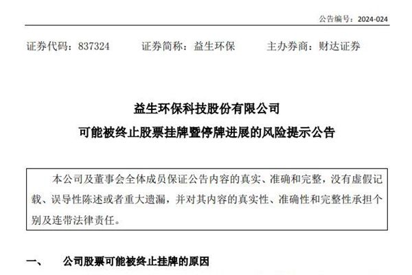 益生环保科技股份有限公司(简称:益生环保)11月14日披露了《可能被终止股票挂牌暨停牌进展的风险提示公告》。 因未能于 2024 年 8 月 30日前完成《2024 年半年度报告》信息披露工作,根据《全国中小企业股份转让系统业务规则(试行)》等相关规定,益生环保股票自 2024 年 9 月 2 日起被实施强制停牌。因益生环保未能在 ...
