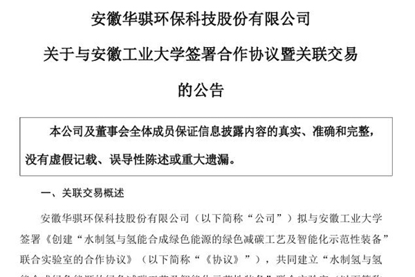 2024年10月24日,安徽华骐环保科技股份有限公司发布《关于与安徽工业大学签署合作协议暨关联交易的公告》。图源:安徽华骐环保科技股份有限公司公告 公告称,华骐环保拟与安徽工业大学签署《创建“水制氢与氢能合成绿色能源的绿色减碳工艺及智能化示范性装备”联合实验室的合作协议》,共同建立“水制氢与氢能合...