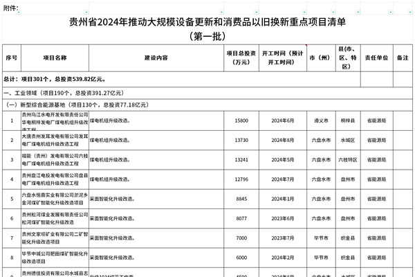 贵州印发《贵州省2024年推动大规模设备更新和消费品以旧换新重点项目清单(第一批)》,包括工业、农业、建筑、交通、教育、文旅、医疗等7大领域,项目共计301个,总投资539.82亿元。 这些项目包括工业领域(项目190个,总投资391.27亿元)——煤电机组升级改造、水循环真空泵及配套装备等基础设施设备更新改...