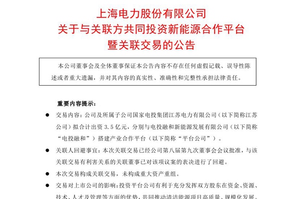2023年8月10日,上海电力发布公告称,公司及所属子公司国家电投集团江苏电力有限公司拟合计出资3.5亿元与电投融和新能源发展有限公司分别成立电投融和(上海)新能源有限公司和江苏电投融宁新能源有限公司(暂定名,最终以工商核定为准)。 本次成立的新能源公司以落实“双碳”战略为依托,以清洁能源主业为发展方向,建立...