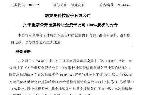 凯龙高科技股份有限公司(简称:凯龙高科)近日公告称,公司同意将挂牌价格在首次挂牌底价 10,082.83 万元的基础上下调 20%,即以 8,066.26万元的价格重新公开挂牌转让江苏希领精密制造有限公司(以下简称“江苏希领”)100%股权。除上述调整外,其余挂牌条件与首次挂牌条件保持一致。本次挂牌起止日预计为...