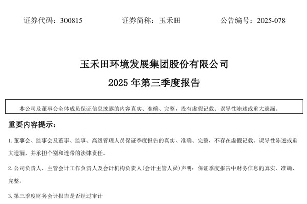 玉禾田环境发展集团股份有限公司(简称:玉禾田)近日发布《2025年第三季度报告》。2025年前三季度,玉禾田实现营业总收入56.4亿元,同比增长7.96%;归母净利润4.31亿元,同比下降13.03%;扣非净利润4.15亿元,同比下降15.28%;经营活动产生的现金流量净额为5.27亿元,同比增长31.46%。图源:玉禾田公告 玉禾...
