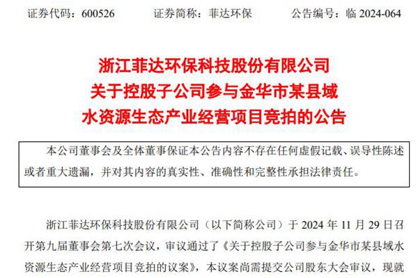 浙江菲达环保科技股份有限公司(简称:菲达环保)11月30日公告称,控股子公司浙江富春紫光环保股份有限公司(下称“紫光环保”)拟以最高不超过人民币 17 亿元价款公开竞拍金华市某县域水资源生态产业经营项目30 年经营权。 紫光环保前期对标的资产进行了详细的尽职调查,标的资产具备一定的盈利能力且财务状况良好。若竞...
