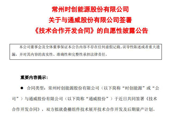 2024年9月23日,常州时创能源股份有限公司发布关于与通威股份有限公司签署《技术合作开发合同》的自愿性披露公告。 公告称,时创能源与通威股份有限公司于近日共同签署《技术合作开发合同》,双方拟就叠栅组件技术展开技术合作开发及后期量产计划。公告称,合同为双方经友好协商达成的合作,不涉及具体确定金额,不构成关联交易,公司将根据后续合作进...