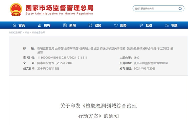 关于印发《检验检测领域综合治理行动方案》的通知国市监检测发〔2024〕80号 各省、自治区、直辖市和新疆生产建设兵团市场监管局(厅、委)、公安厅(局)、生态环境厅(局)、住房城乡建设厅(委、管委)、交通运输厅(局、委): 现将《检验检测领域综合治理行动方案》印发你们,请结合实际认真贯彻落实。 市场监管总局 公安部 生态环境部 住房城...
