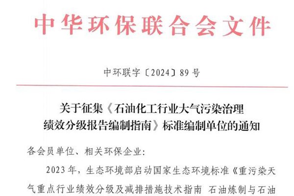 关于征集《石油化工行业大气污染治理绩效分级报告编制指南》标准编制单位的通知 各会员单位、相关环保企业: 2023年,生态环境部启动国家生态环境标准《重污染天气重点行业绩效分级及减排措施技术指南石油炼制与石油化学工业》(以下简称《技术指南》)的编制工作并已公示征求意见稿,预计2024 年内发布并开始执行。本标准适用于重污染天气石油炼...