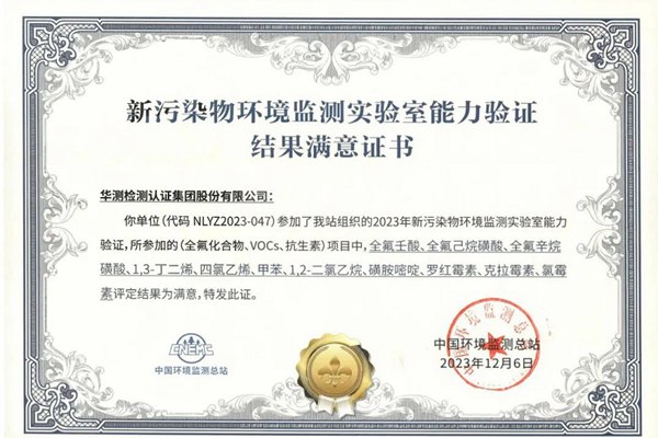 2023年,华测检测认证集团股份有限公司(简称CTI华测检测)参加了中国环境总站组织的新污染物环境监测实验室能力验证,并于近期成功获得全氟化合物、挥发性有机物(VOCs)和抗生素项目结果满意证书,成为国内首批获此认证的机构。 我国是全球化学品生产和使用大国,随着化学工业对国民经济的支撑比重日益加大,有毒有害物质的生产使用持续增高,新...