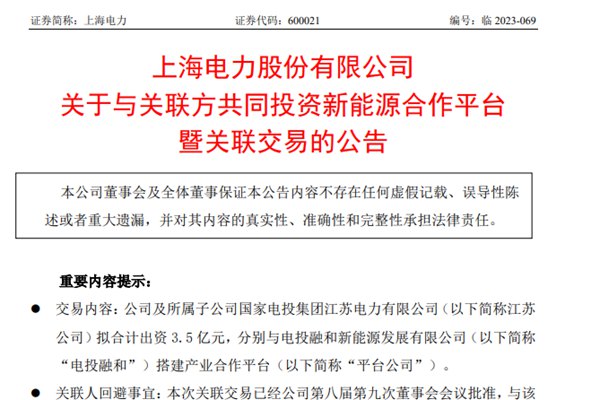 2023年8月10日,上海电力股份有限公司(简称:上海电力)公告称,将与所属子公司国家电投集团江苏电力有限公司(下称“江苏公司”)合计出资 3.5 亿元,分别与电投融和新能源发展有限公司(下称“电投融和”)搭建产业合作平台(下称“平台公司”)。本次交易构成关联交易...