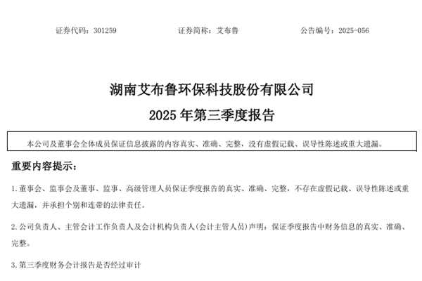 湖南艾布鲁环保科技股份有限公司(简称:艾布鲁)近日发布《2025年第三季度报告》。2025年前三季度,艾布鲁实现营业总收入1.97亿元,同比增长74.38%;净亏损739.73万元,亏损同比减少77.94%;基本每股收益为-0.05元。图源:艾布鲁公告 截至报告期末,艾布鲁资产总计为16.34亿元,应收账款为1.96亿元;现金流量方...