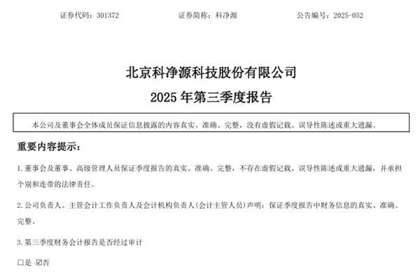 北京科净源科技股份有限公司(简称:科净源)近日发布《2025年第三季度报告》。2025年前三季度,科净源实现营业总收入2.42亿元,同比增长39.72%;净利润1597.18万元,同比扭亏为盈,去年同期亏损3890.02万元;基本每股收益为0.23元。图源:科净源公告 资产方面看,截至报告期末,科净源资产总计为14.31亿元,应收账...