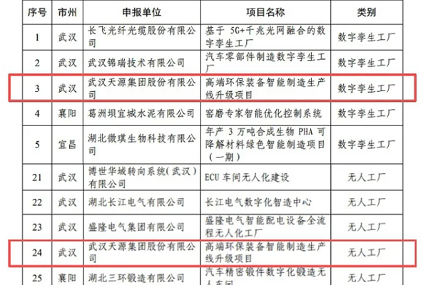 近日,湖北省经济和信息化厅正式公布了“2025年湖北省数字孪生工厂和无人工厂”名单,武汉天源集团“高端环保装备智能制造生产线升级项目”凭借在智能制造领域的深度布局与转型突破,成功实现“双项入选”,成为湖北省装备制造行业数字化转型的标杆企业。 该项目是武汉天源集团...