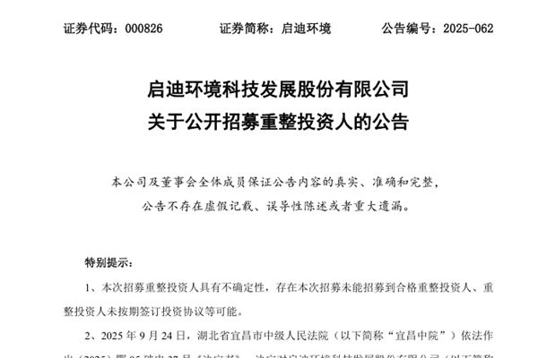 9月27日,启迪环境科技发展股份有限公司(简称:启迪环境)发布《关于公开招募重整投资人的公告》。根据该公告,为顺利推进公司预重整及重整工作,稳妥有序化解公司债务风险,恢复和提升公司持续经营和盈利能力,实现资源整合、维护和保障债权人公平受偿权益,公司临时管理人结合公司实际情况和预重整工作安排,公开招募启迪环境的重整投资人。 本次招募重...