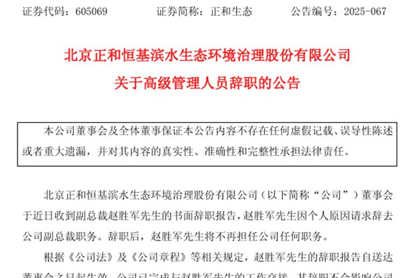 北京正和恒基滨水生态环境治理股份有限公司(简称:正和生态)公告称,公司董事会近日收到副总裁赵胜军先生的书面辞职报告,赵胜军先生因个人原因请求辞去公司副总裁职务。辞职后,赵胜军先生将不再担任公司任何职务。 截至本公告披露日,赵胜军先生持有正和生态721,900股股份,占公司总股本的比例为0.34%。图源:正和生态公告 申明:本站发布...