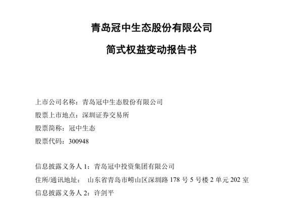 青岛冠中生态股份有限公司(简称:冠中生态)近日发布《简式权益变动报告书》。报告书显示,冠中生态控股股东冠中投资及实际控制人李春林先生、许剑平女士与杭州深蓝财鲸人工智能科技合伙企业(有限合伙)(下称:深蓝财鲸)签署了《青岛冠中投资集团有限公司与杭州深蓝财鲸人工智能科技合伙企业(有限合伙)关于青岛冠中生态股份有限公司之股份转让协议》,控股...
