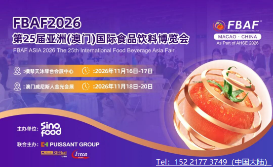 2026亚洲国际食品饮料博览会(澳门) 举办日期:2026年11月18日至20日 举办展馆:澳门·威尼斯人金光会展 举办城市:澳门 举办周期:一年一届 举办次数:第二十五届 展出面积:60,000 平方米 预计参展企业及品牌:1,000+ 个 预计专业观众:20,000+ 人次 国家及地区:30+ 个 组织机构:中食时代(...